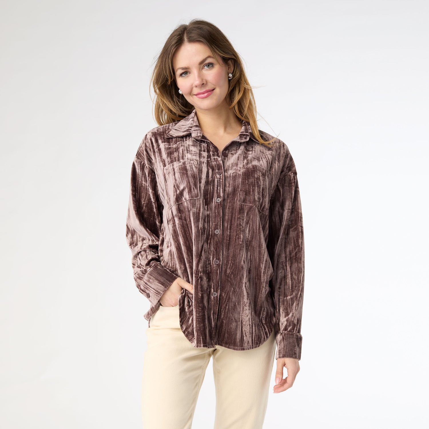 Meet the Avyanna Crinkle Velour Button Front Top, your plush, polished essential for every season. Crafted from soft, crinkle velour with a gentle stretch, it delivers all-day comfort and a luxe, subtle sheen. The classic button front and relaxed silhouette make it easy to style open or closed, layered or solo. Dress it up with trousers or down with denim for a versatile women’s top that moves from day to night.