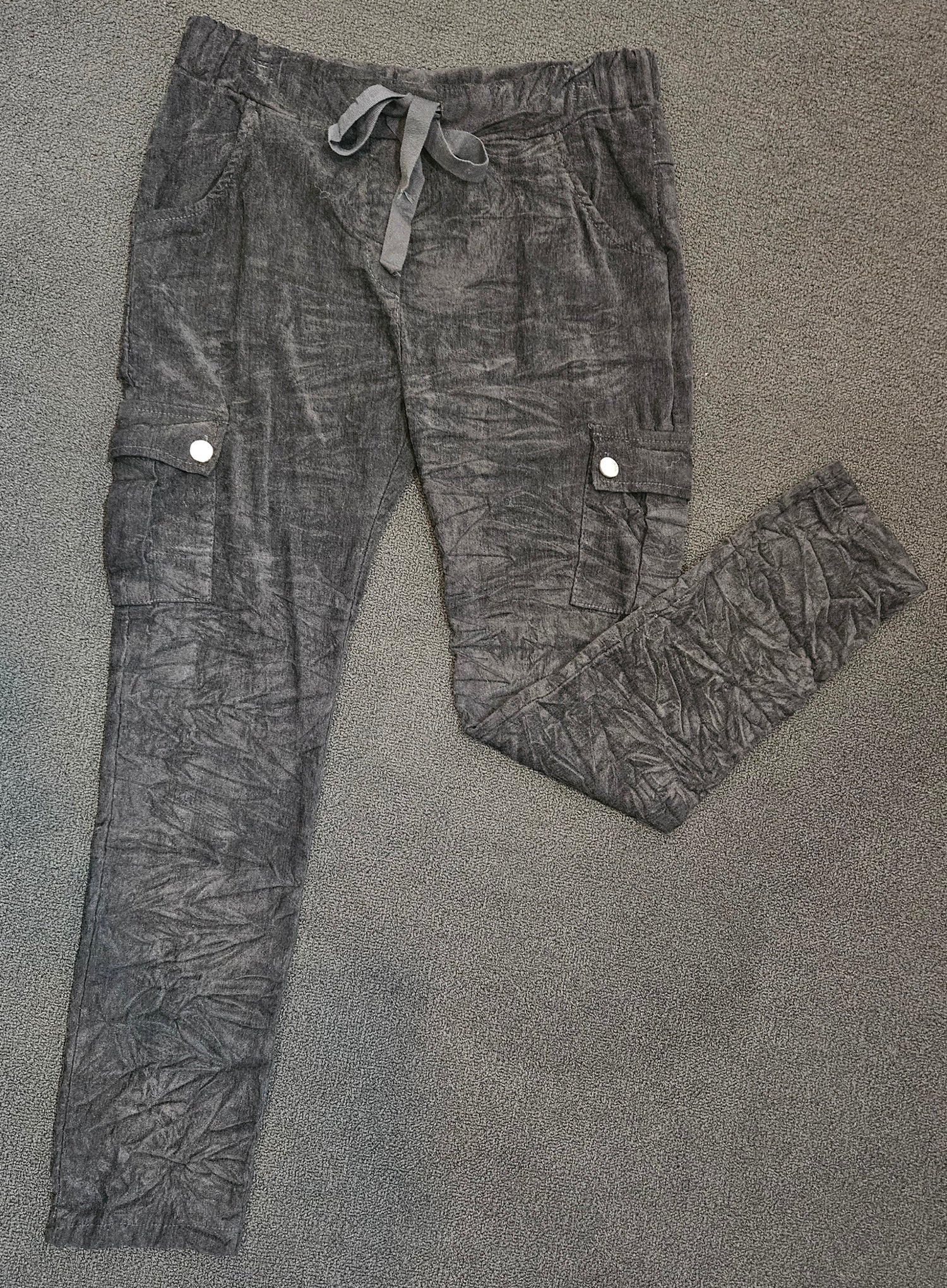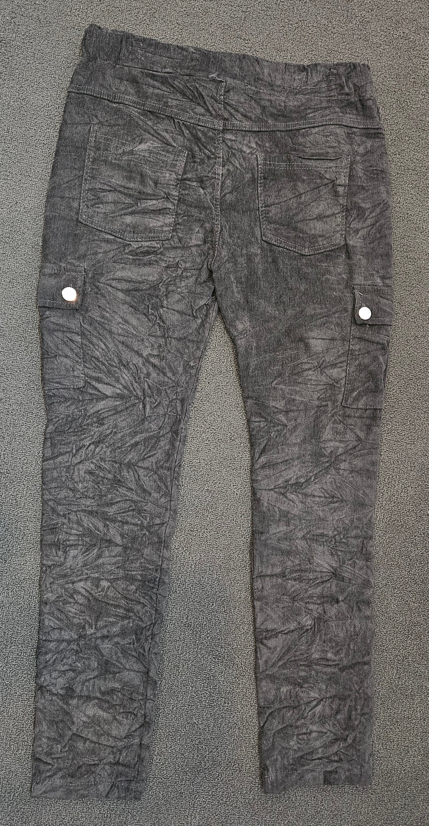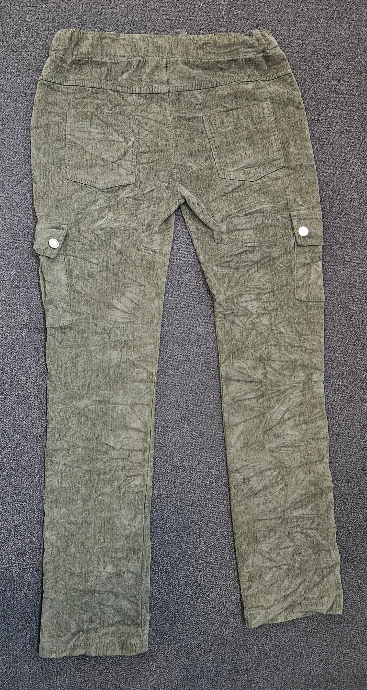 Style: Pull-on trouser with adjustable tie waist and side utility pockets.