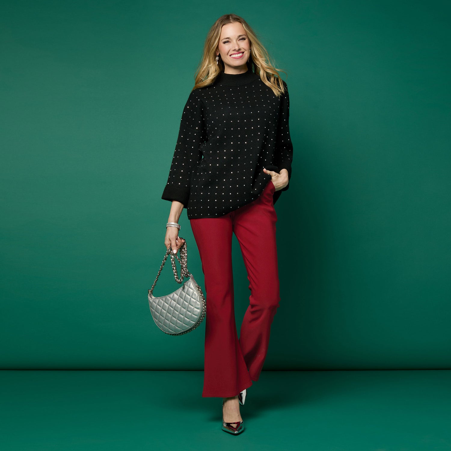 Step into effortless glamour with the Heavenly-Luxe Mock Neck Rhinestone Sweater. Its sleek mock neck silhouette offers cozy warmth, while sparkling rhinestone accents add a dazzling touch that elevates any look. Perfect for dressing up or adding shine to casual outfits, this sweater combines comfort and chic style for standout appeal all day long.