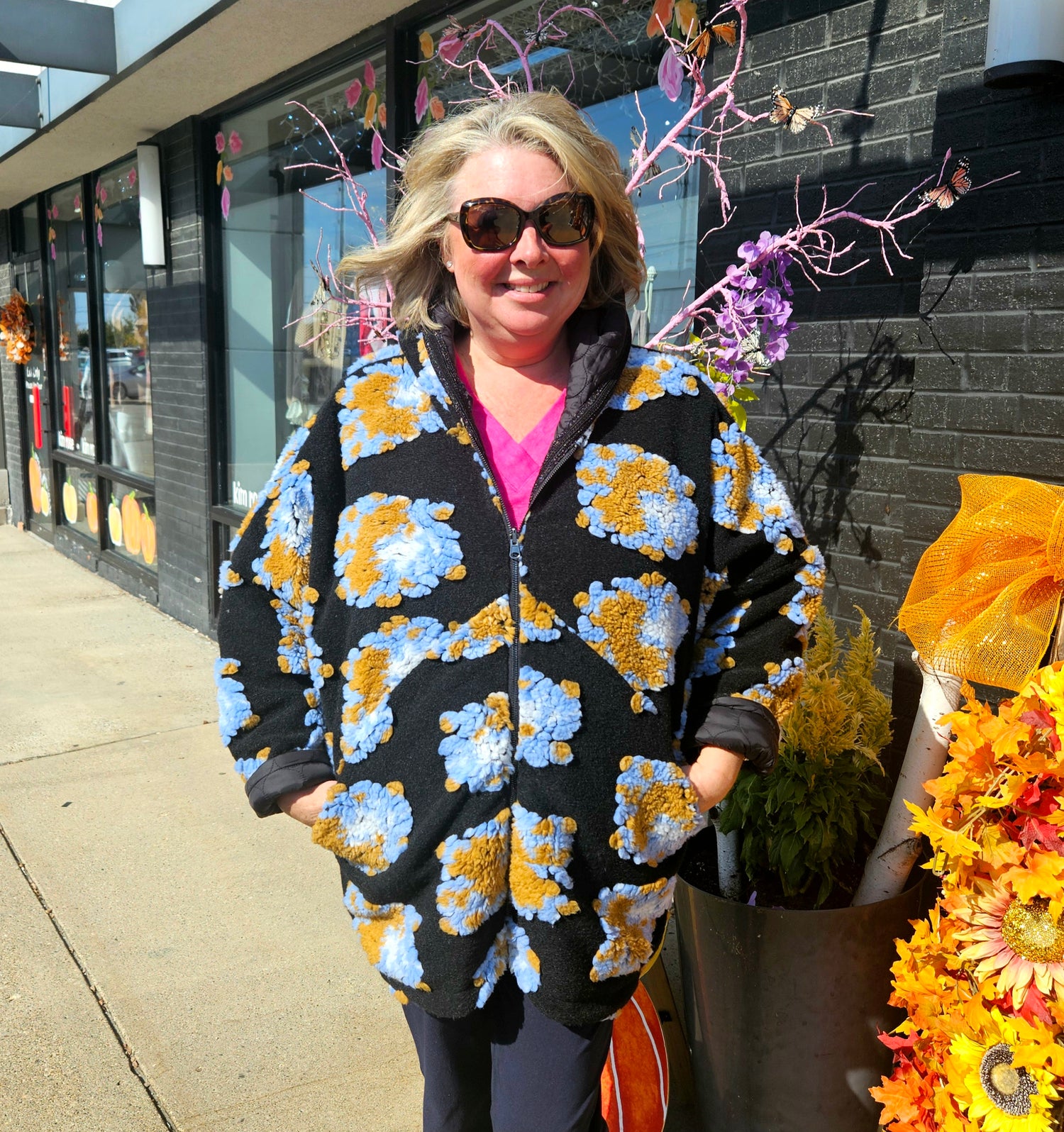 Cozy meets statement style with our Zip-Up Floral Coat. Crafted from plush sherpa with bold blue and yellow floral accents, this coat is as eye-catching as it is comfortable. The smooth lined interior adds a layer of softness, while the hood and zip-up design make it perfect for effortless everyday wear.